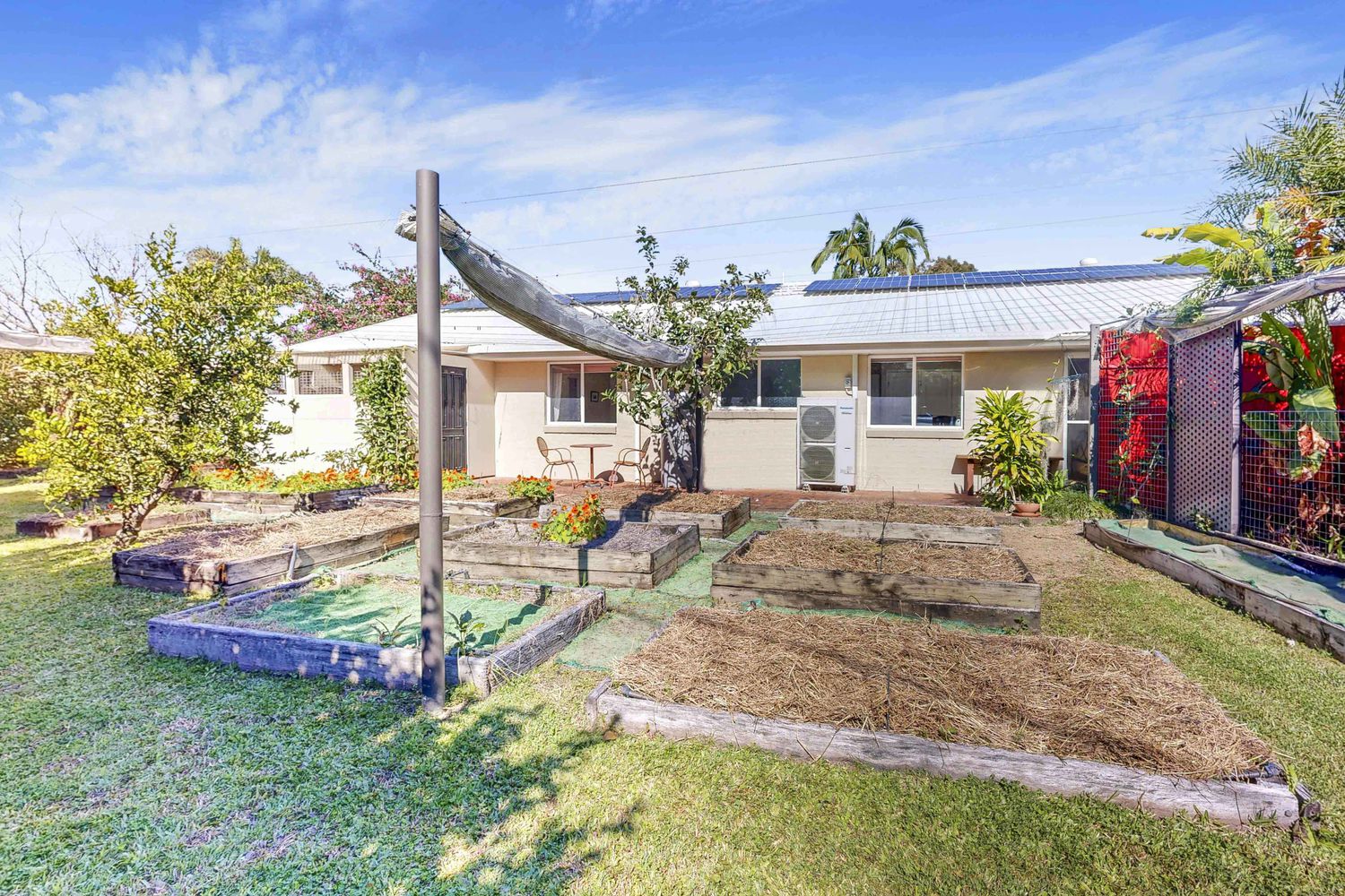 - Raised veggie beds with shade covers
