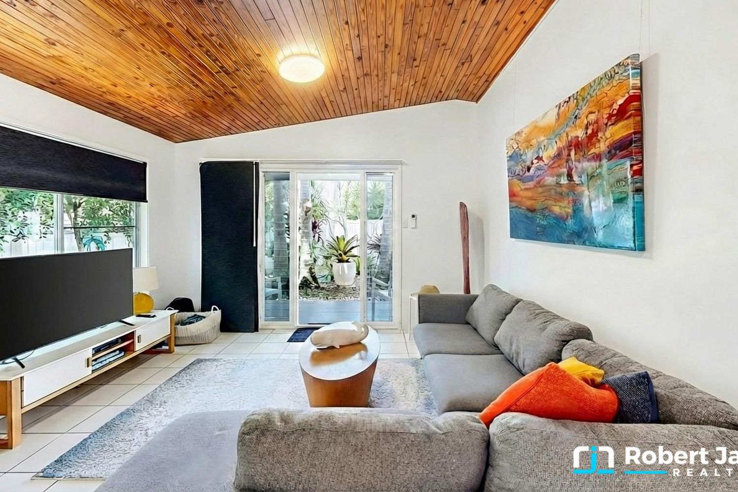 • Light-filled living with soaring timber ceilings