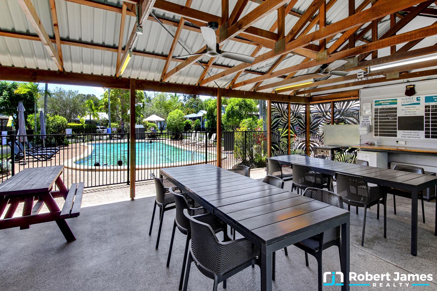 Living, dining, kitchen is open plan with reverse cycle air conditioning, cool white plantation shutters, all this area overlooks and opens out to the front covered deck which runs along the front of the home. Ideal spot to sit and relax, wonderful and shady in the summer. The entertaining deck has pull down blinds to protect this area from the sun and when the weather is inclement, makes it cosy during the cooler months. Leave up during the summer months to catch the cooling breezes off Noosa River which is just at the end of the street.