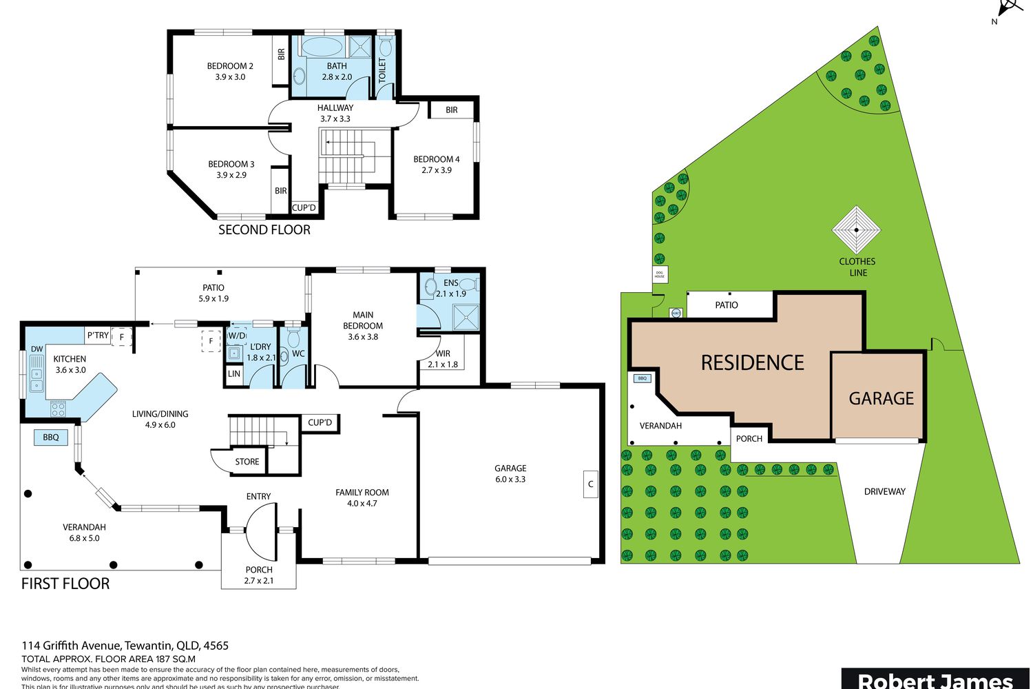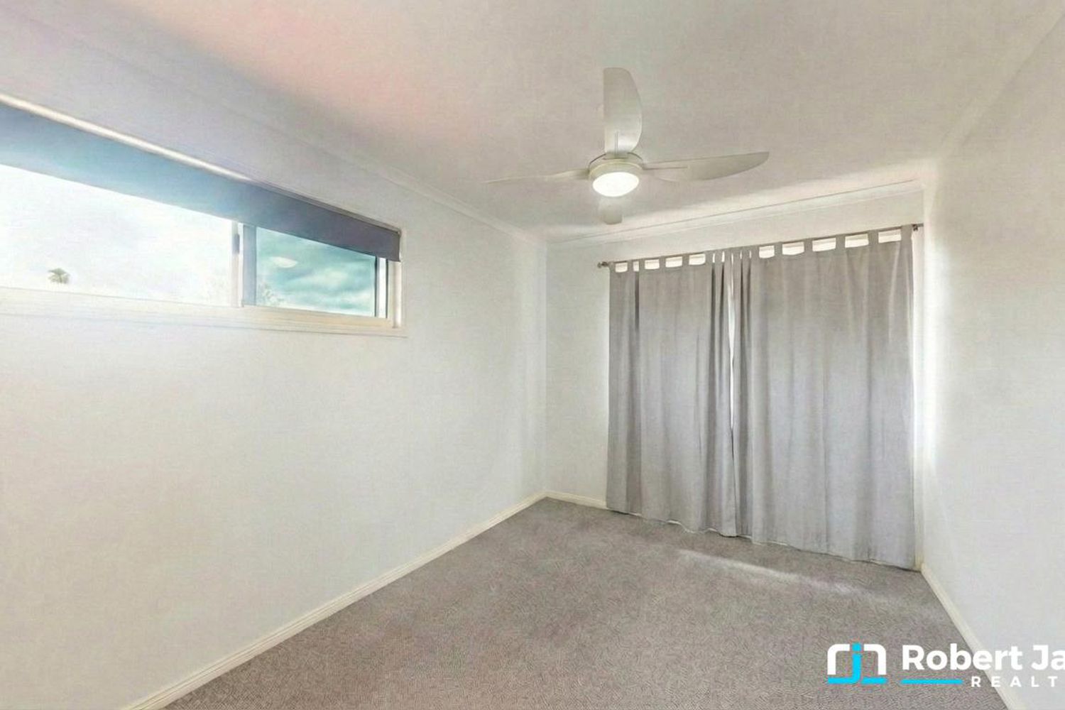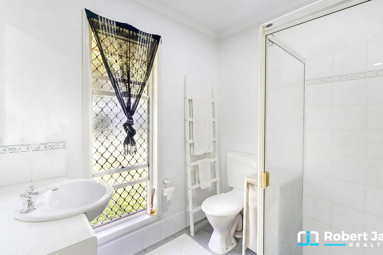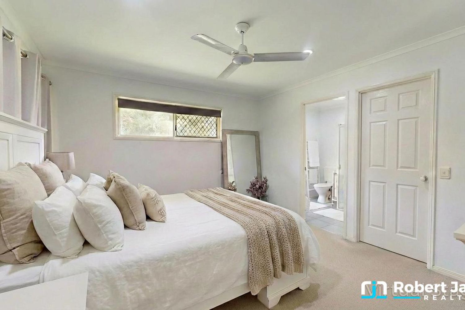 The master bedroom is conveniently located downstairs and includes a walk-in robe and private ensuite. Upstairs, the remaining three bedrooms are fitted with built-in robes and ceiling fans, serviced by a central family bathroom with a separate toilet.
